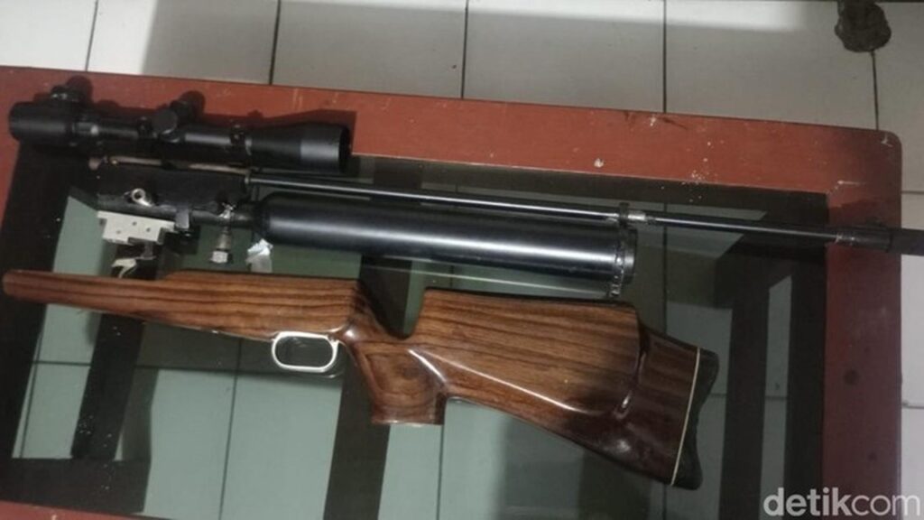Senapan angin yang digunakan dalam insiden ini adalah jenis PCP (Pre-Charged Pneumatic) kaliber 4,5 milimeter. Senjata rakitan ini memiliki popor kayu berwarna cokelat tua dengan serat yang terlihat jelas. Tabung udara bertekanan tinggi berwarna hitam terpasang sejajar dengan larasnya.