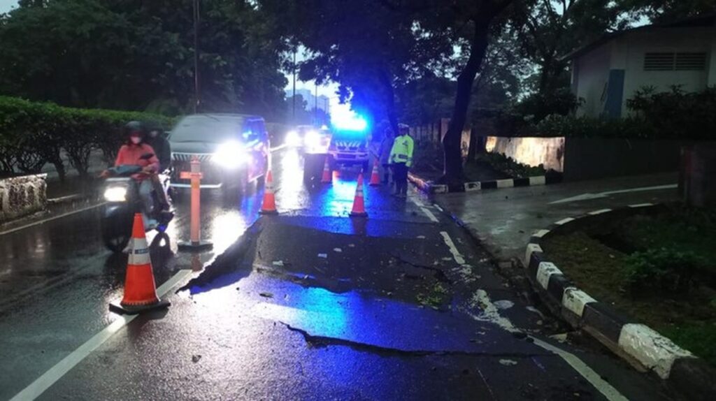 “Terdapat Jalan amblas di Griya Raya Pademangan arena lake side Jakarta Utara, sementara hanya satu lajur yang bisa dilalui,” demikian bunyi laporan TMC Polda Metro.