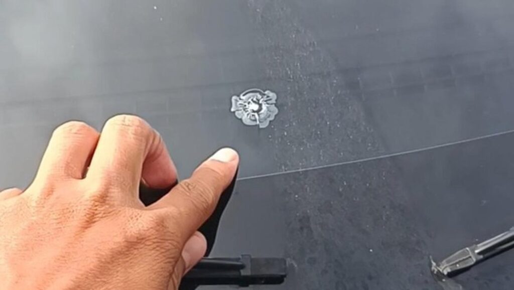 Saat ia hendak mendahului kendaraan lain, tiba-tiba sebuah kerikil terlempar dan menghantam kaca depan mobilnya. Ia mendengar suara benturan keras dan mendapati kacanya telah retak.