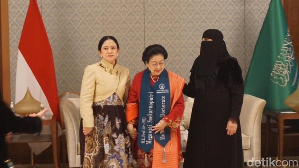 Presiden ke-5 RI, Megawati Soekarnoputri, mengenalkan putrinya yang juga Ketua DPR RI, Puan Maharani, saat menyampaikan pidato di Princess Nourah Bint Abdulrahman University (PNU) di Riyadh, Arab Saudi. Megawati mengaku selalu mengajarkan putrinya bahwa perempuan harus bisa segalanya, namun tetap tidak boleh melupakan kodratnya sebagai ibu dan istri.