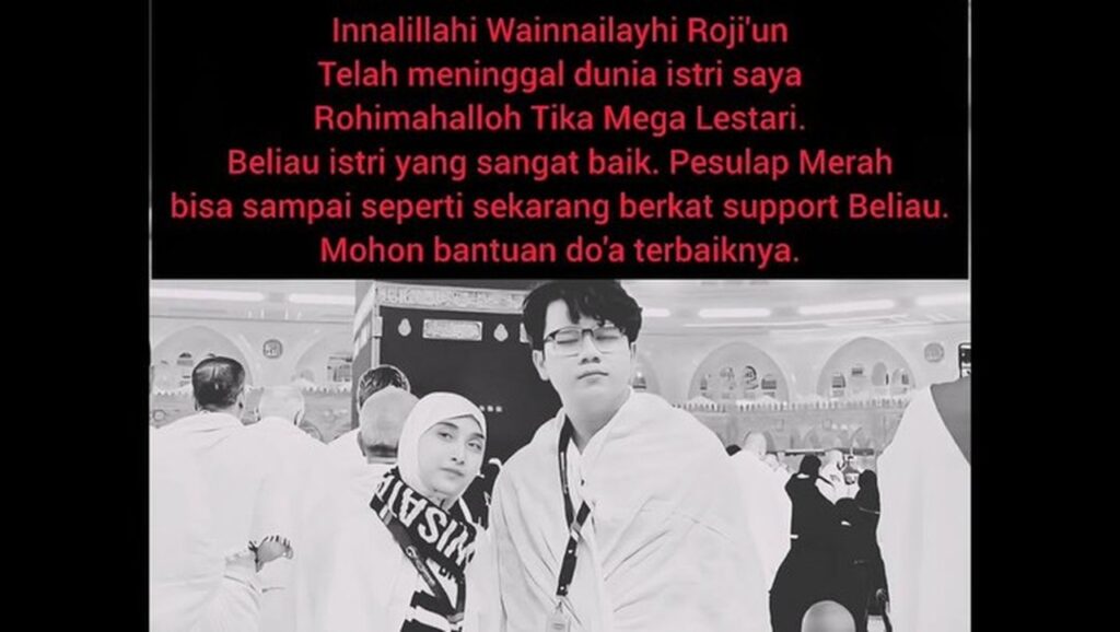 Pesulap Merah kembali menegaskan betapa penting peran sang istri dalam kariernya. “Innalillahi Wainnalillahi rojiun, telah meninggal dunia istri saya Rohimahallah Tika Mega Lestari. Beliau istri yang baik. Pesulap Merah bisa sampai sekarang berkat support Beliau. Mohon bantuan doa terbaiknya,” tulisnya.