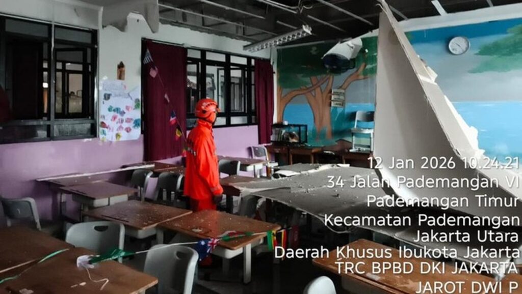 Jakarta – Plafon di SDN 05 Pademangan Timur, Jakarta Utara, ambruk pada Senin (12/1/2026) pagi saat para siswa sedang menyantap menu makan bergizi gratis (MBG). Peristiwa ini terjadi di tengah guyuran hujan lebat yang melanda wilayah tersebut.