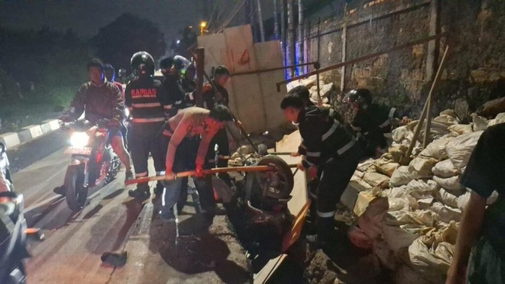 Pantauan di lokasi pada Minggu (11/1/2026) malam, motor korban tampak terbalik di dalam lubang galian dengan posisi ban menghadap ke atas. Sejumlah petugas kepolisian yang tiba di lokasi terlihat melakukan evakuasi motor menggunakan bantuan kayu.