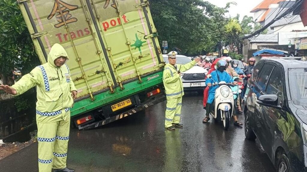 Informasi mengenai insiden ini pertama kali disampaikan melalui akun X TMC Polda Metro Jaya. Dalam unggahannya, terlihat truk Fuso tersebut ‘nangkring’ di bahu jalan dengan roda kiri bagian belakang masuk ke dalam saluran air.