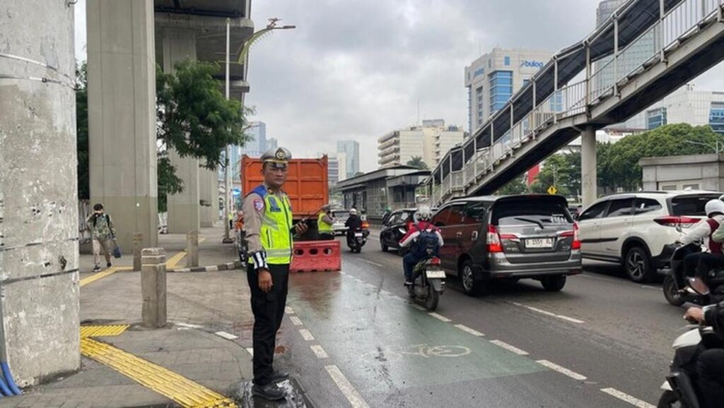 Aplikasi navigasi Google Maps mengonfirmasi adanya kepadatan lalu lintas yang terpantau dari arah Tugu Pancoran menuju kawasan Kuningan pada pagi hari ini. Petugas NTMC Polri, Demi, menyatakan bahwa meskipun lalu lintas di sekitar lokasi cukup padat, pengendara lainnya masih dapat melintas.